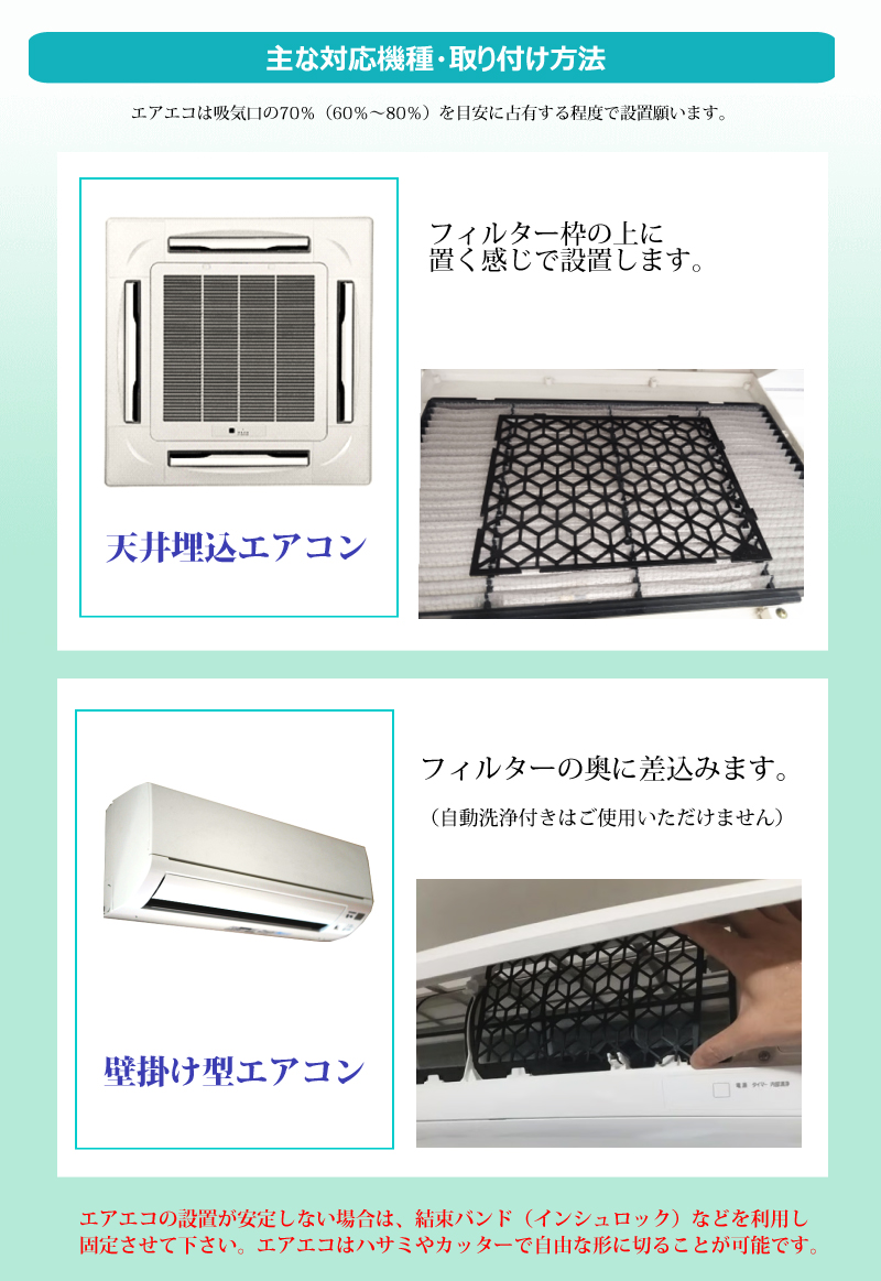 | エアエコは吸気口の70%(60%~80%)を目安に占有する程度で設置願います。 |