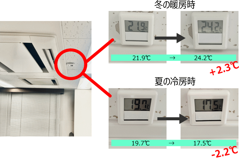 エアエコを設置することで、エアコンの吹き出し口温度が冷房時には低く、暖房時には高くなります。
